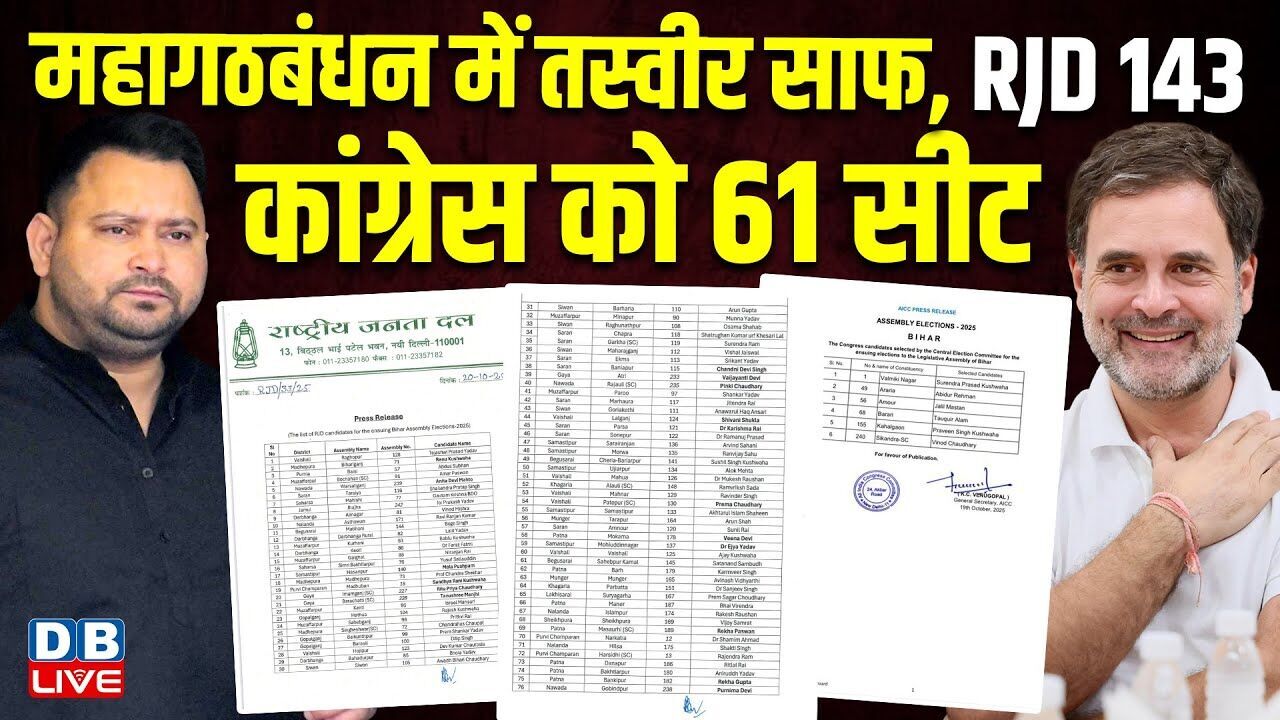 महागठबंधन में तस्वीर साफ, RJD 143, कांग्रेस को 61 सीट | कई सीटों पर अभी भी फ्रेंडली फाइट |#dblive